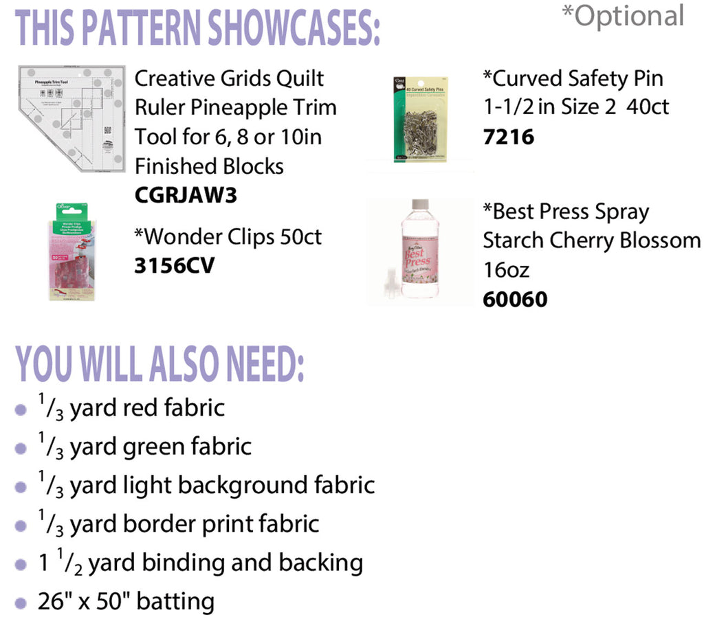 CLPDHE021 - 17in x 40 1/2in. The Creative Grids Pineapple Trim Tool (CGRJAW3) is required. Designed by Deb Heatherly.This pattern includes fabric requirements and instructions to make the project shown. Confident beginner skill level.