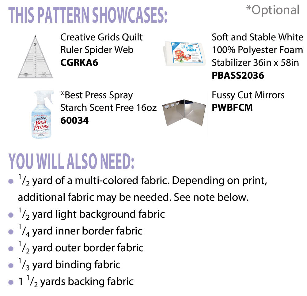 Note: Additional fabric may be required to make kaleidoscope designs that match perfectly. Prints with 8 repeats per width, border prints or prints with horizontal stripes work best.